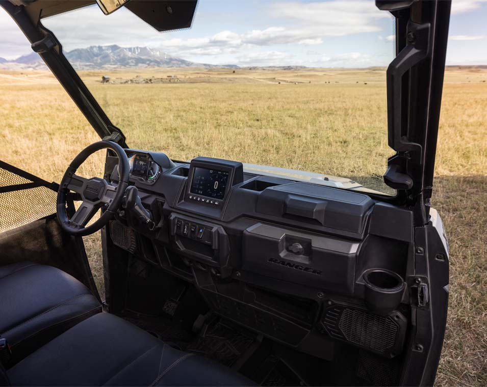 - Premium Cut & Sew Seats with Contoured Seatbacks and Embroidered Polaris Branding, Premium Steering Wheel and Interior Accents, Polaris Pulse Electrical System (6 position), DC Outlets, Dual USB Port, Cargo Box Located 12V SAE Port with In-Dash On/Off Switch.