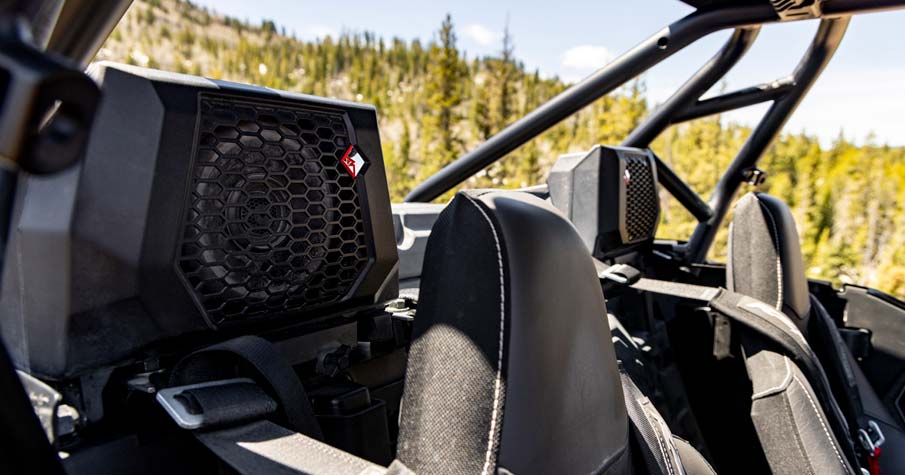 - Factory-tuned and integrated Rockford Fosgate Stage 4 audio system with RIDE COMMAND source unit. Includes: (2) 100-W 1" tweeters, (2) 100-W 6.5" component front speakers, (2) 100-W 6.5" coaxial rear speakers, (1) 400-W 4-channel amplifier, and (1) 10" subwoofer with an integrated 400-W subwoofer amplifier. Audio system is IPX7- and IPX9K-water immersion tested to withstand the wet elements.