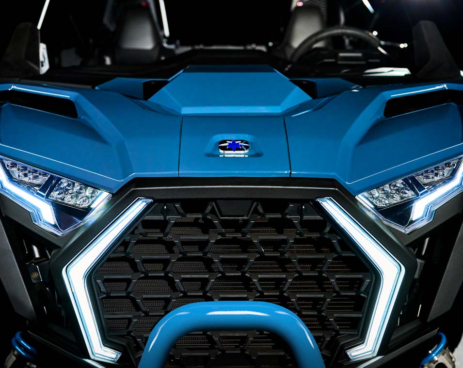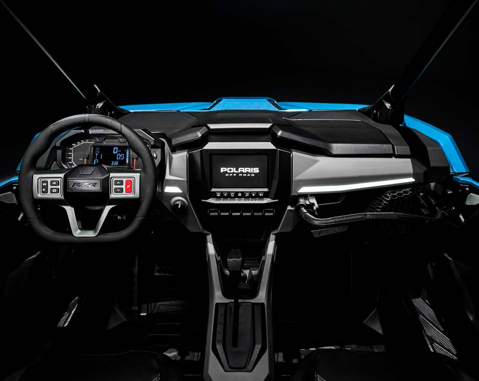 - Signature animated RZR Fang Accent Lighting; white LED low/high and red LED tail/brake lights; animated interior accent lighting.